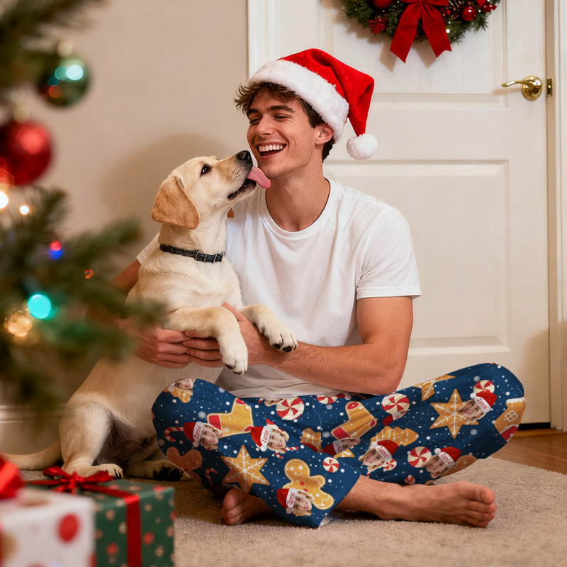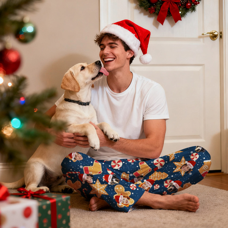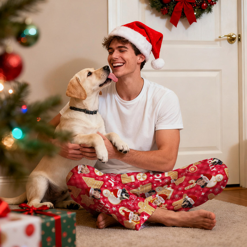 Home / Custom Adult Pajama Pants with Pet Picture & Festive Gingerbread Plaid