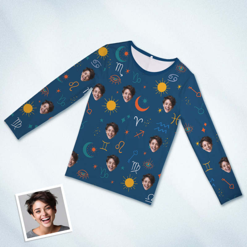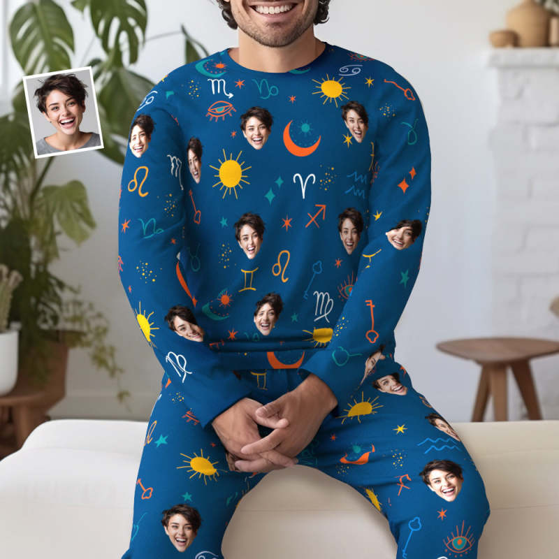 Custom Face Pajamas Sleepwear Personalized Round Neck Blue Pajamas Constellation Symbol For Women And Men