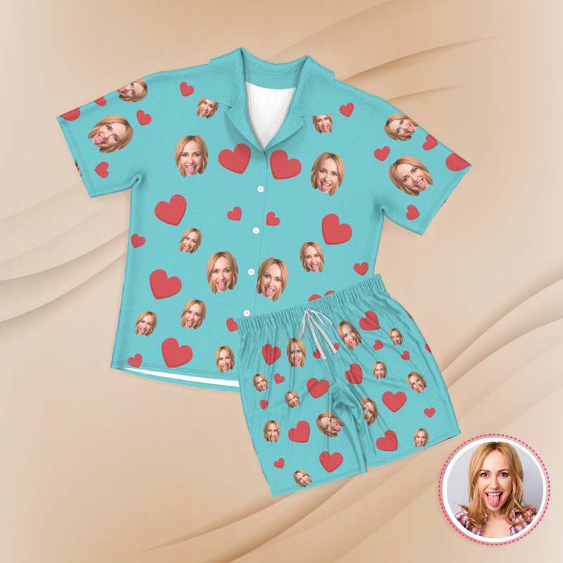 Custom Face Short Sleeve Pajamas Custom Red Heart Photo Pajamas