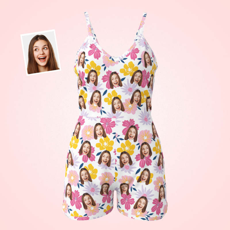 Custom Face Sling Jumpsuit Shorts Personalized Photo Colorful Flowers Sleeveless Pajama For Women